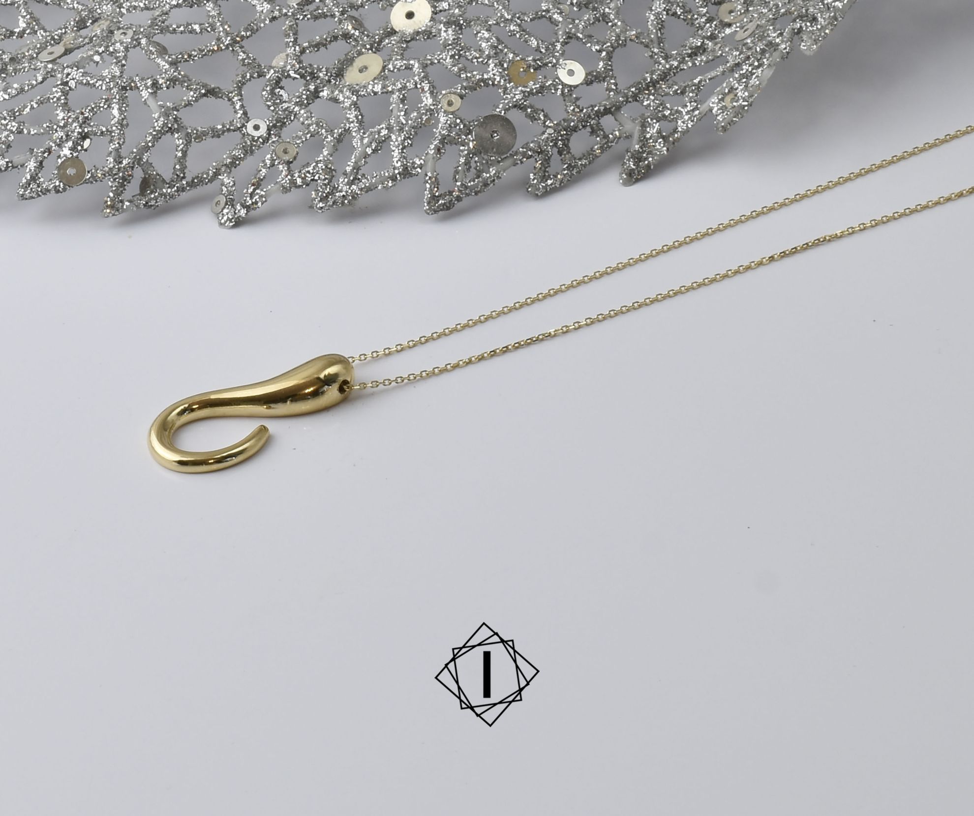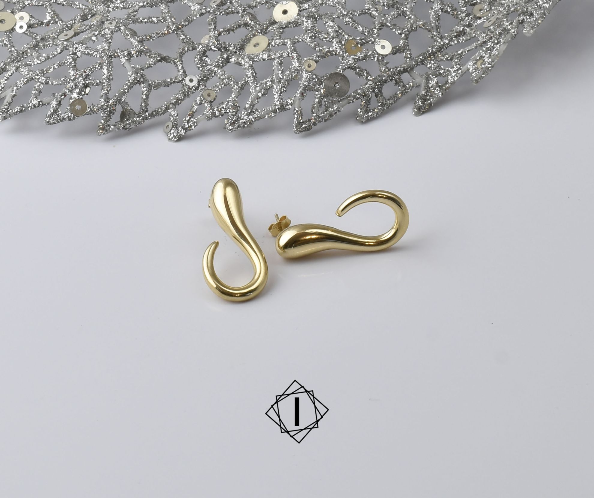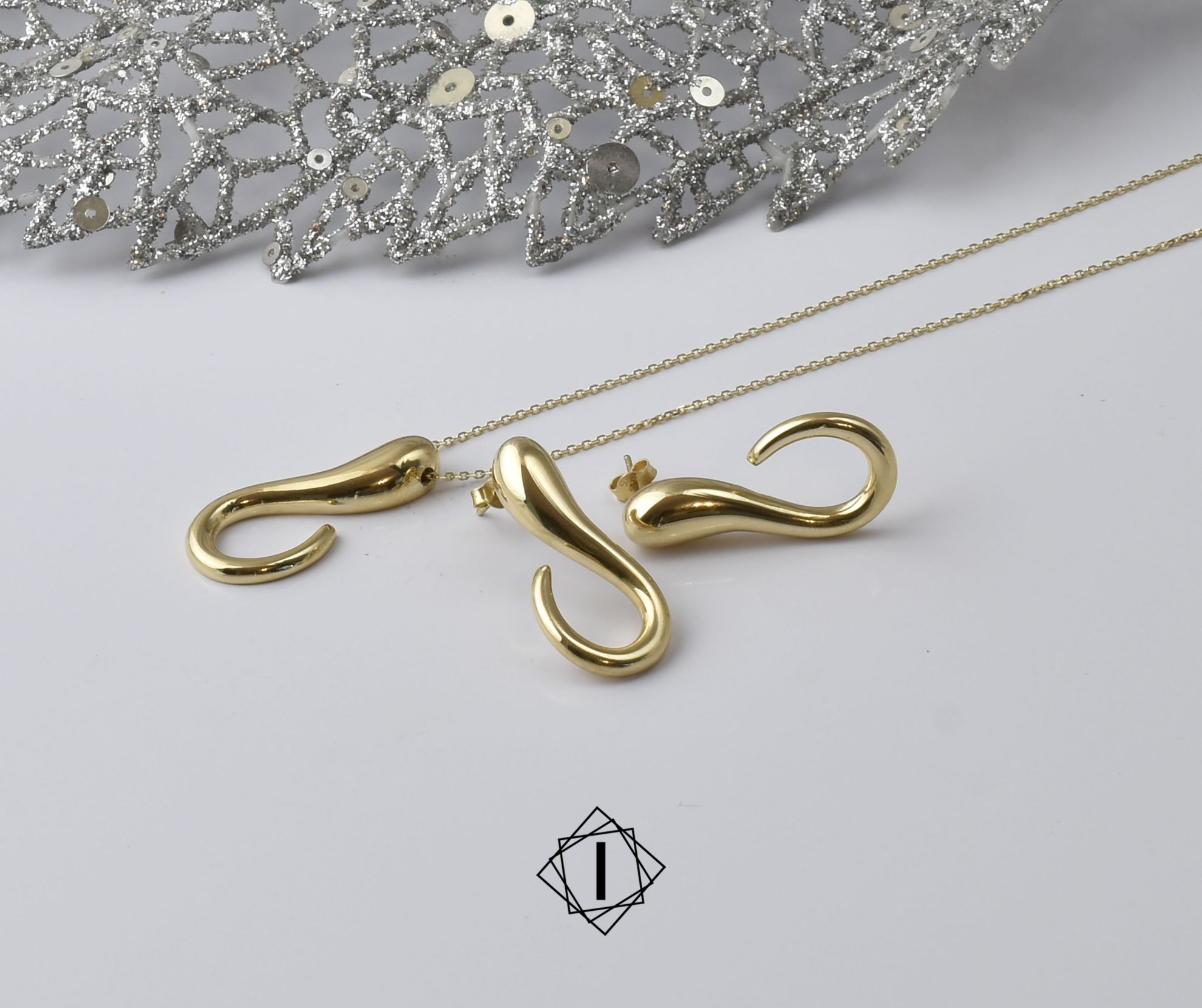 Zlatni komplet nakita neobičnog oblika koji sadrži ogrlicu i minđuše. Sa ovim kompletom ćete sigurno biti primećeni.
